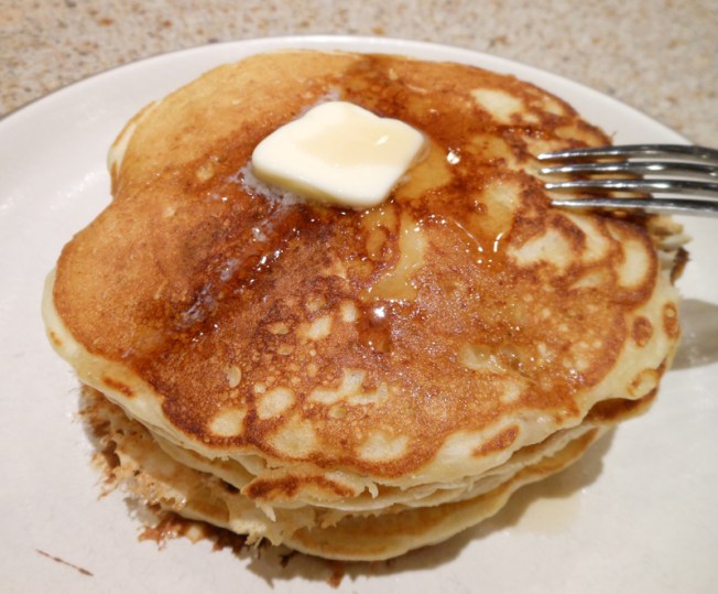 Set a nonstick griddle over moderate heat.  Lightly butter the griddle.  Spoon 2 tablespoons of the batter onto the griddle for each pancake and use and offset spatula to spread each on into a 4-inch round.  Cook the pancakes until the bottoms are golden and the tops are set, 2 to 3 minutes.  Flip the pancakes and cook until golden, about 1 minute longer.  Transfer the pancakes to plates and serve with maple syrup.
