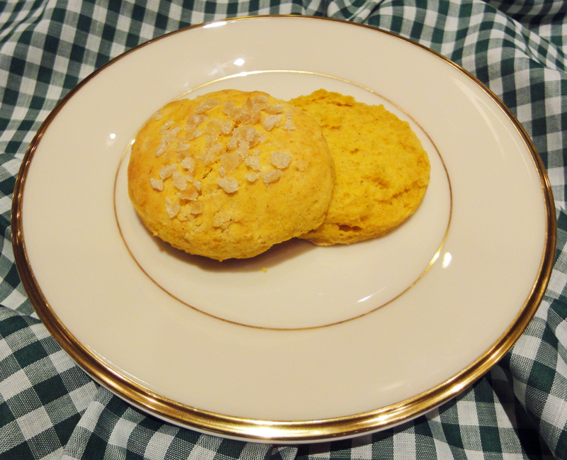 Turn dough out onto a lightly floured surface and knead lightly just a few times. Roll dough into a 1/2″ thick 9″ x 5″ rectangle and dust the top with flour. Fold dough crosswise into thirds again and gently roll or pat to a 3/4″ thickness. This process helps to make your biscuits tall, with a layered textured. Using a 2 1/2″ biscuit cutter, cut dough into 10 rounds. Place dough rounds 1″ apart on your prepared baking sheet. Lightly press some candied ginger into the top of each round.