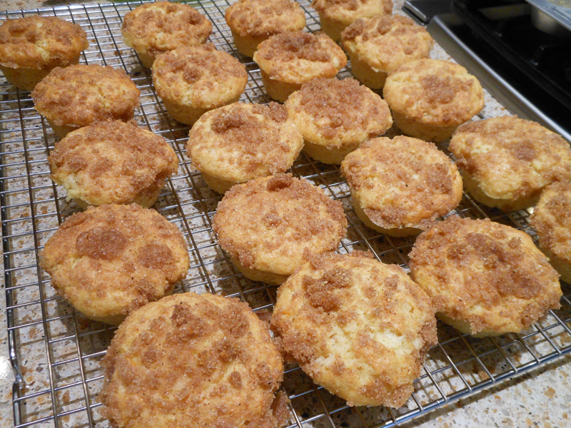 These muffins are a favorite of my husband.  He loves anything orange.  They are best eaten warm from the oven as they tend to get a little dry the next day.  If you can’t eat them all the first day, freeze them.  Then take a muffin out, put it on a microwave safe dish and nuke it for 1 minute at 50% power.  It’s just as good as coming right out of the oven.