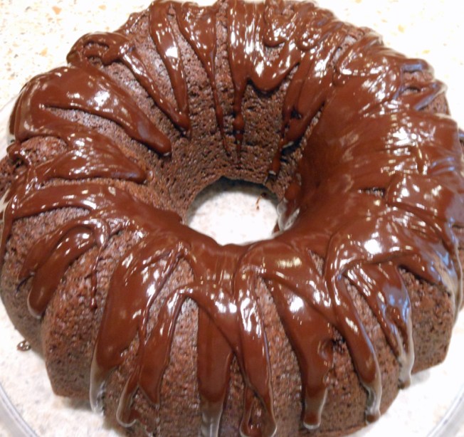 Bake for 50 to 55 minutes, or until top is springy to the touch and a wooden toothpick inserted comes out clean.  Cool cake thoroughly in pan at least an hour and a half before inverting onto a plate.  If desired, dust the cake with powdered sugar or put a chocolate drizzle on it.