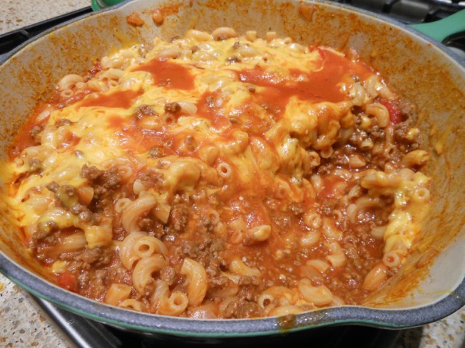 Add macaroni, tomato sauce, broth, oregano, paprika, salt and reserved beef to skillet and bring to boil. Cover, reduce heat to low, and simmer, stirring occasionally, until pasta is tender. Sprinkle with cheese. Serve.