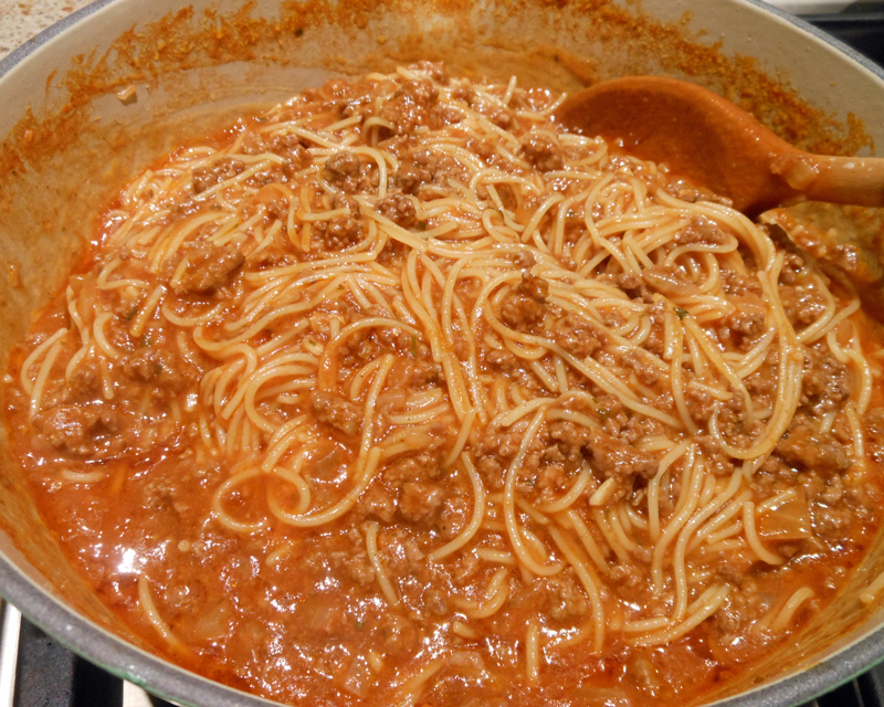Cook beef in a large nonstick skillet or a dutch oven over medium-high heat, until no longer pink. Drain beef, leaving 2 tablespoons fat in skillet, and reserve. Add onion, red pepper and garlic to fat in skillet and cook, covered, until softened.