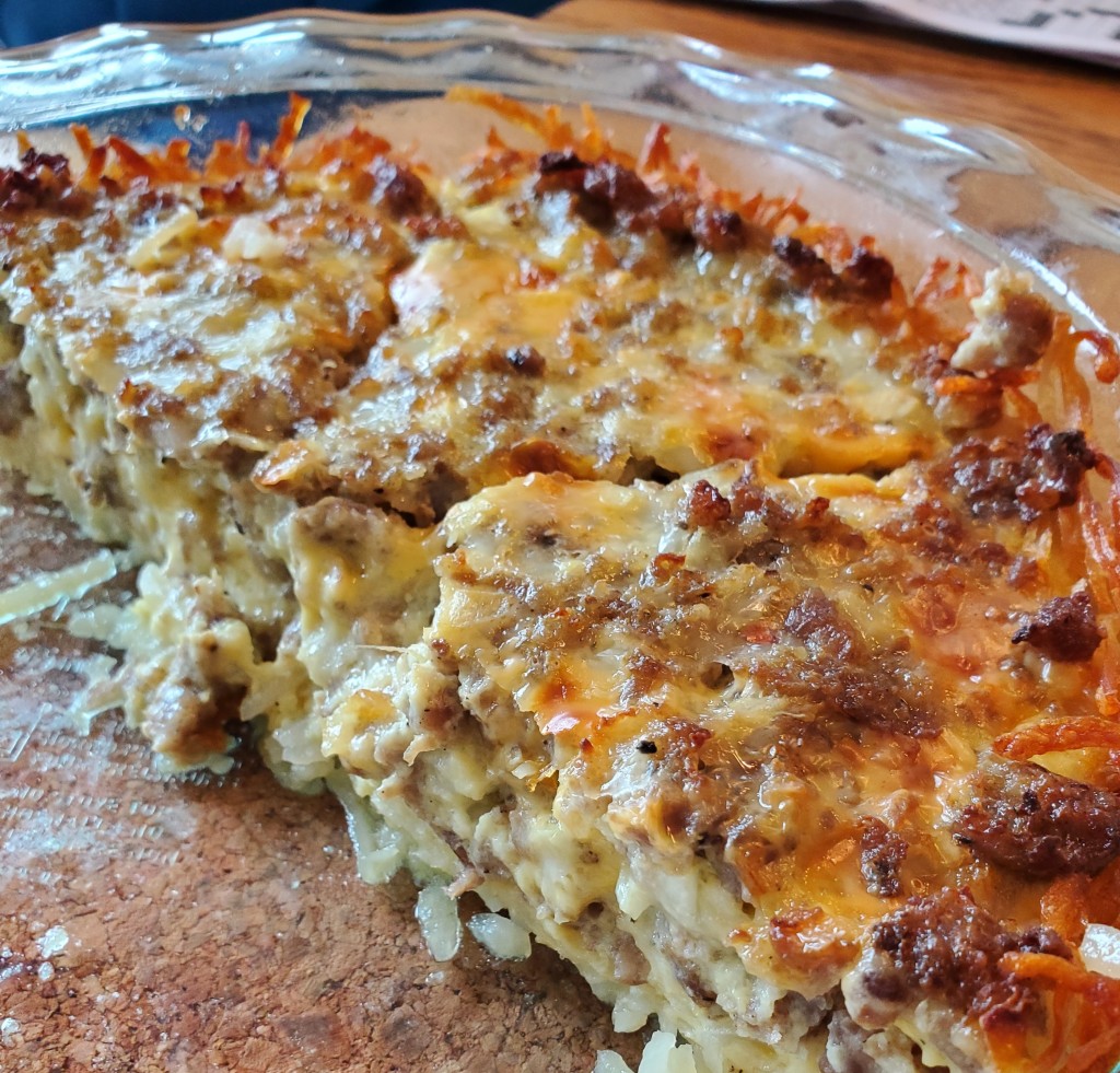 This is so easy to make and so delicious! Buttery hash browns form the crust for the yummy cheese and sausage filling. It is great for breakfast, lunch or dinner.